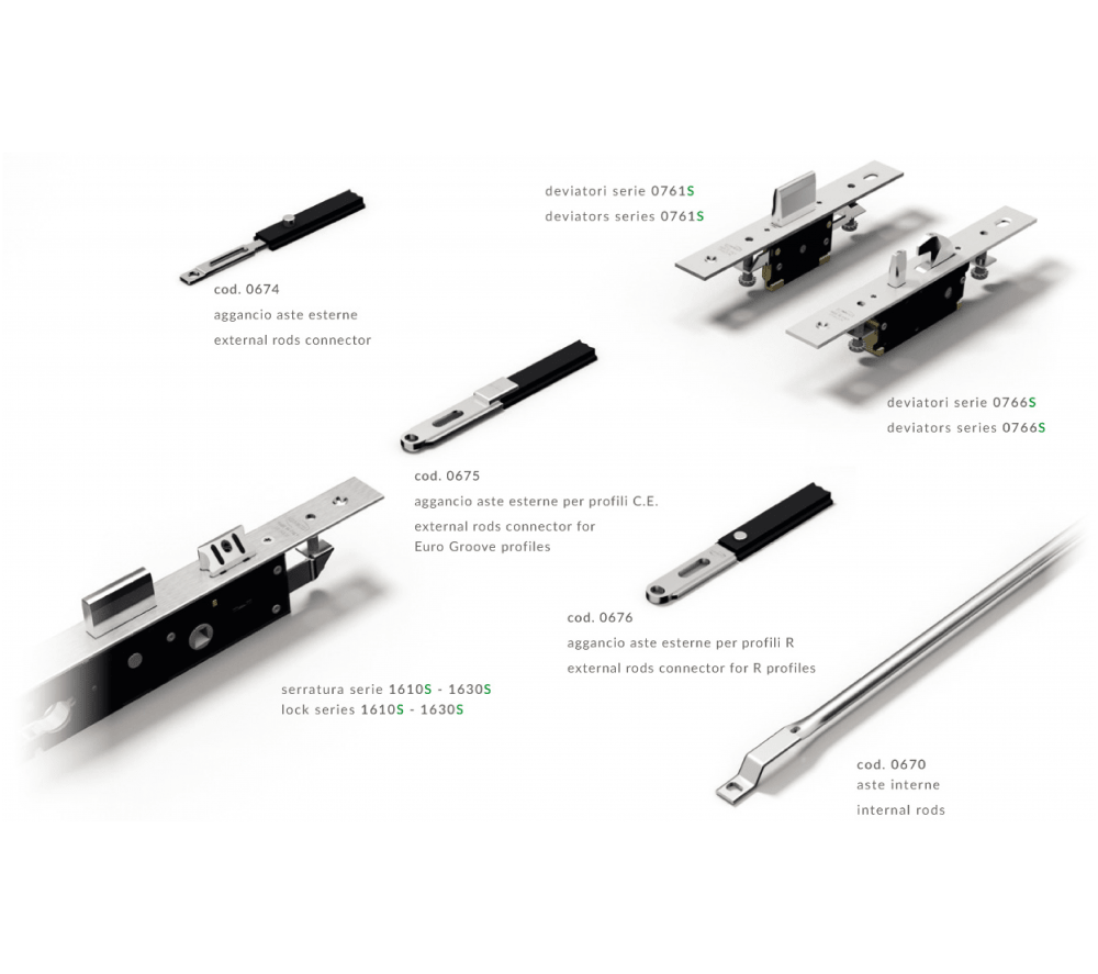 Compatible with Omec kits for additional locking points to meet any needs of security closing with rods and additional latches, up to 5 locking points and to any door lenght.